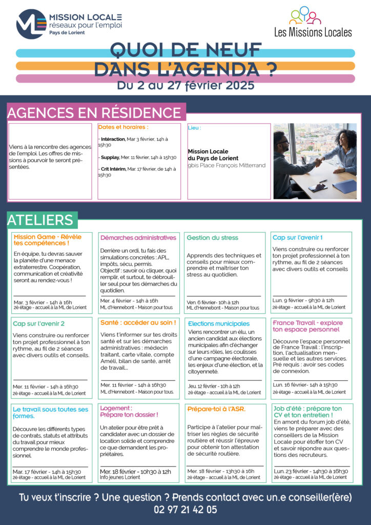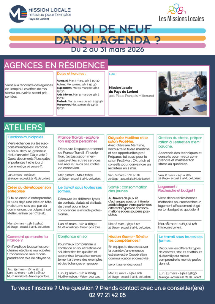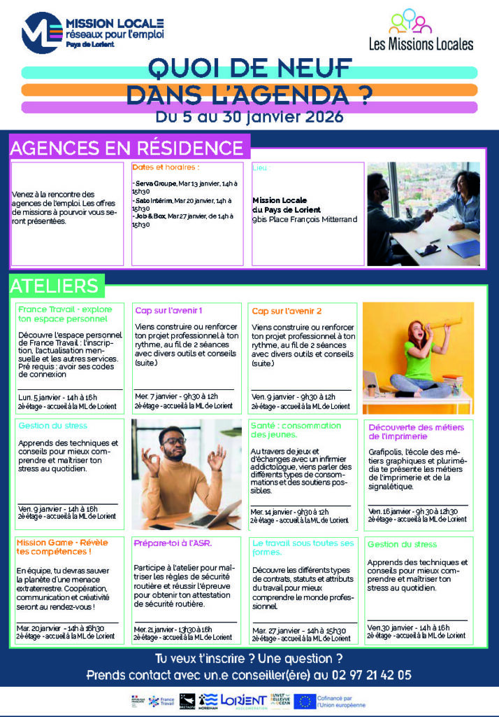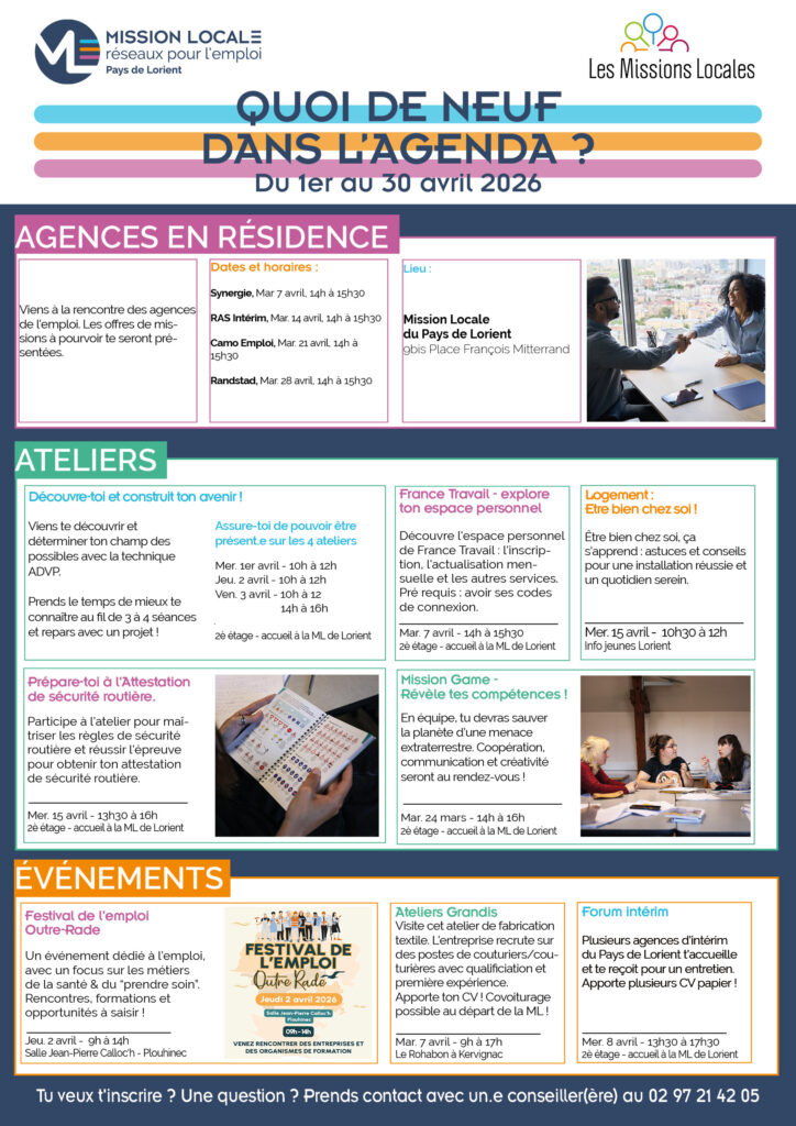 La Mission Locale du Pays de Lorient sera fermée ce lundi 10 et mardi 11 novembre 2025. Nous vous retrouvons le mercredi 12 novembre sur nos antennes (Lorient gare, Lanester et Hennebont) et nos permanences sur tout le territoire.
